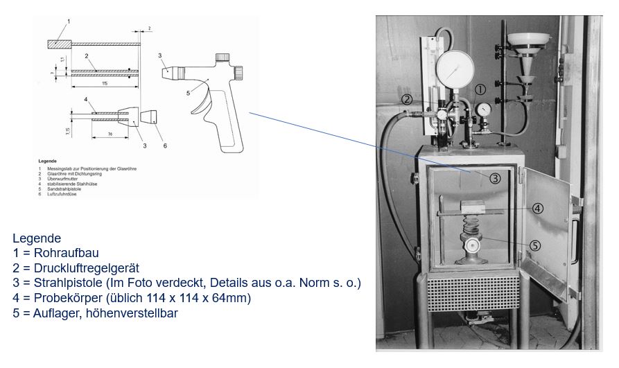 Bestimmung nach DIN EN ISO 16282 mit definierter SiC-Körnung in einem Luftstrom bei Umgebungstemperatur. Das gleiche Prinzip wird nach ISO 16349 bei erhöhter Temperatur (900 °C) angewendet. In beiden Fällen wird als Ergebnis das erodierte Volumen an Feuerfestmaterial in cm³ ermittelt.