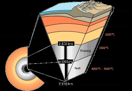 Die Erde ist im Prinzip eine Kugel von ca. 12.800 km Durchmesser, die schalenförmig aufgebaut ist. Im Inneren gibt es einen festen Kern aus Eisen und Nickel (1.250 km Durchmesser). Daran schließt sich eine zähflüssige Kugelschale von ca. 2.880 km Dicke an (überwiegend Eisen). Hierauf folgt die zähflüssige Schale aus Silikaten und Oxiden mit ca. 2.900 km Dicke und darüber die relativ dünne, 5 bis 10 km mächtige, harte Erdkruste, die im Wesentlichen aus erstarrten Silikaten und Oxiden besteht.