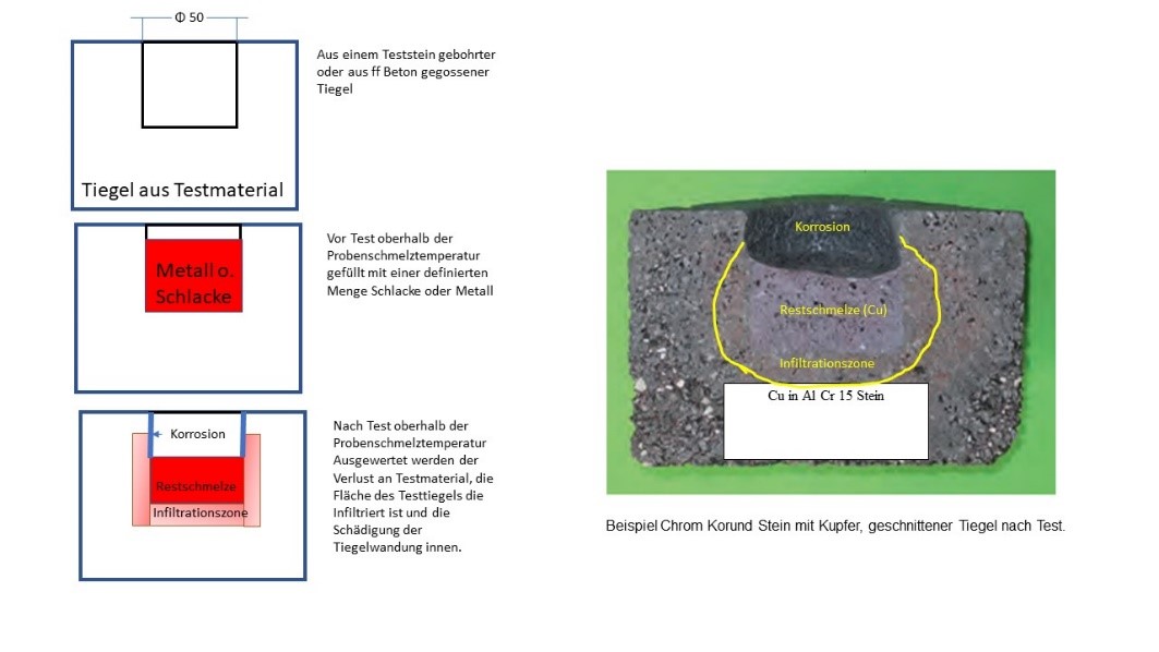 Der Korrosionstest ist eine Methode, den chemischen Angriff von Schlacken, Schmelzen, Gasen, Flüssigkeiten und Dämpfen auf feste Materialien zu untersuchen. In der DIN CEN/TS 15418 sind Verfahren für feuerfeste Baustoffe, nämlich Tiegeltest, Fingertest und rotierende Schlacke genormt. Die Beurteilung der Korrosionsbeständigkeit erfolgt durch optische Bewertung der geschnittenen Probe.