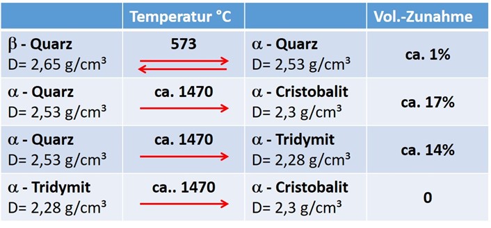 Quarz (SiO2) ist das wesentliche Mineral in den Quarzit-Rohstoffen und liegt dort in seiner Tieftemperaturform β-Quarz vor. Diese Modifikation verändert während des Erhitzens ihre Kristallstruktur, was teilweise mit erheblichen Volumen- und damit auch Dichte-änderungen verbunden ist. Die Tabelle zeigt diese Vorgänge. Während die β - α-Quarzumwandlung reversibel ist, sind die anderen irreversibel. Gewisse Mineralisatoren fördern die Cristobalit- bzw. Tridymitbildung, was besonders bei ungeformten quarzitischen Feuerfesterzeugnissen genutzt wird.