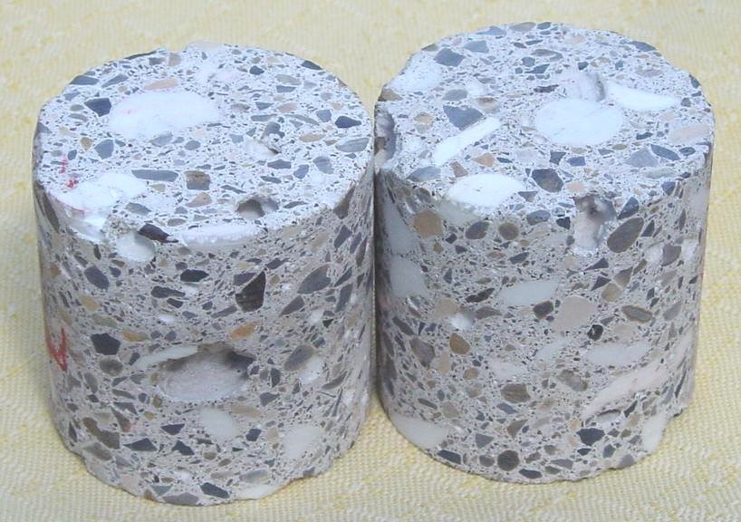 * Feuerbeton-Probekörper: (50 mm hoch, 50 mm Ø) nach Trocknung bei 110 °C. (weiß = Sintertonerde-Körner, dunkel = Normalkorund-Körner)
