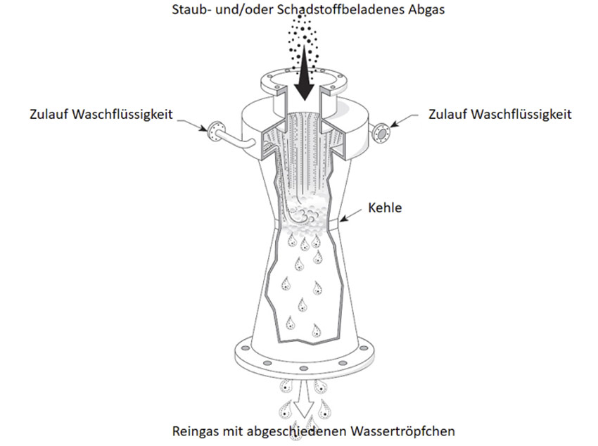 Im Wäscher wird der Abgasstrom mit einem Flüssigkeitsstrom zusammengebracht. Als Flüssigkeiten werden Lösemittel wie Wasser, aber auch Suspensionen wie Kalkmilch (Rauchgasentschweflung) eingesetzt. Durch Beschleunigung und Entschleunigung des Gasstroms und der zerstäubten Waschflüssigkeit entstehen hohe Turbulenzen zwischen Gas, Staub und den Flüssigkeitstropfen. Die Staubpartikel werden zügig befeuchtet und die chemischen Reaktionen erfolgen schnell. Mithilfe eines nachgeschalteten Abscheiders werden die Flüssigkeitstropfen und der angefeuchtete Staub aus dem Gasstrom entfernt.