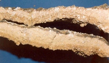 Sie treten an der heißen Seite der Feuerfestauskleidung auf. Meistens verursacht durch Einwirkung von Fremdstoffen und daraus resultierenden Mineralneubildungen unter Volumenveränderungen. Die oft schalenförmigen Abplatzungen (siehe Bild) werden durch Temperaturwechselbeanspruchung verstärkt.