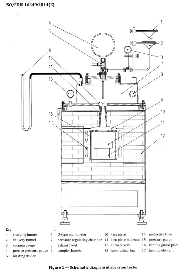 Bestimmung nach DIN EN ISO 16282 mit definierter SiC-Körnung in einem Luftstrom bei Umgebungstemperatur. Das gleiche Prinzip wird nach ISO 16349 bei erhöhter Temperatur (900 °C) angewendet. In beiden Fällen wird als Ergebnis das erodierte Volumen an Feuerfestmaterial in cm³ ermittelt.