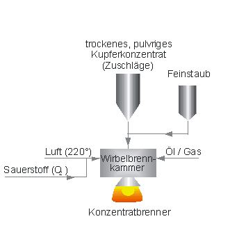 In einem Konzentratbrenner werden feinkörnige Kupferkonzentrate (0,5 bis 1 mm), gemischt mit Zuschlägen und 15 bis 20 % Kohlenstaub (90 % <0,5 mm), kontinuierlich mit Luft, Gas und Sauerstoff verbrannt, bzw. aufgeschmolzen.