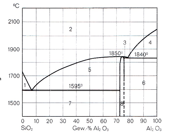 Mullit ist die einzige stabile Mischoxidverbindung zwischen SiO2 und Al2O3 und besteht aus 72 bis 80 Gew.-% Al2O3. Die Zusammensetzung ist von der Bildungstemperatur abhängig. Natürliche Minerale wie Andalusit oder Sillimanit (Al2O3.SiO2) wandeln sich beim Brennen zur feuerfesten Keramik im Temperaturbereich zwischen 1300 bis 1500 °C in die einzige thermodynamisch stabile Phase Mullit und Glas um. (Zweistoffsystem)