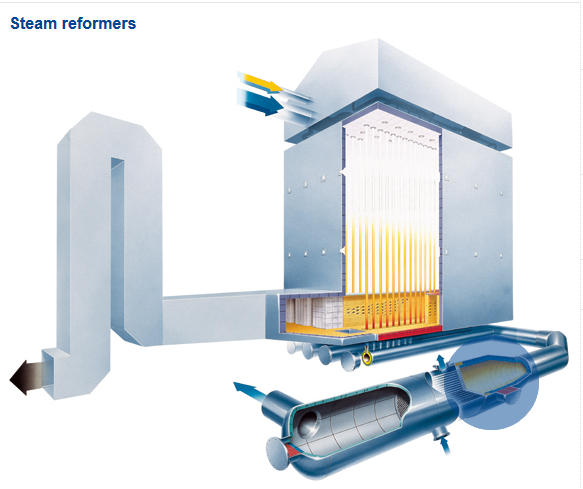Im Primärrefomer oder auch Röhrenreformer (Haber-Bosch-Verfahren) wird in der Regel Methangas Erdgas (CH4) mit Hilfe von Wasserdampf und von außen zugeführter Wärme bei 870°C und 30 bar Druck gemäß der Reaktionsgleichung: